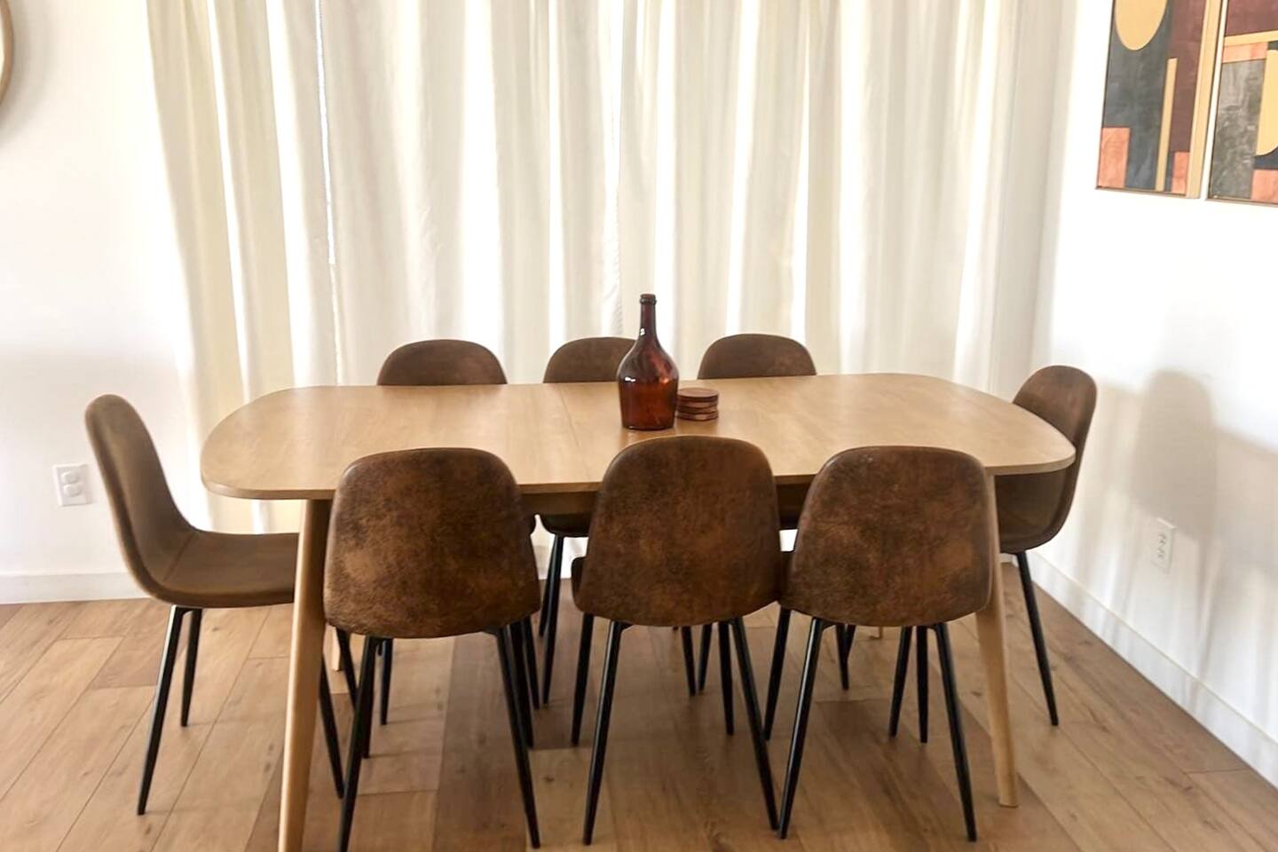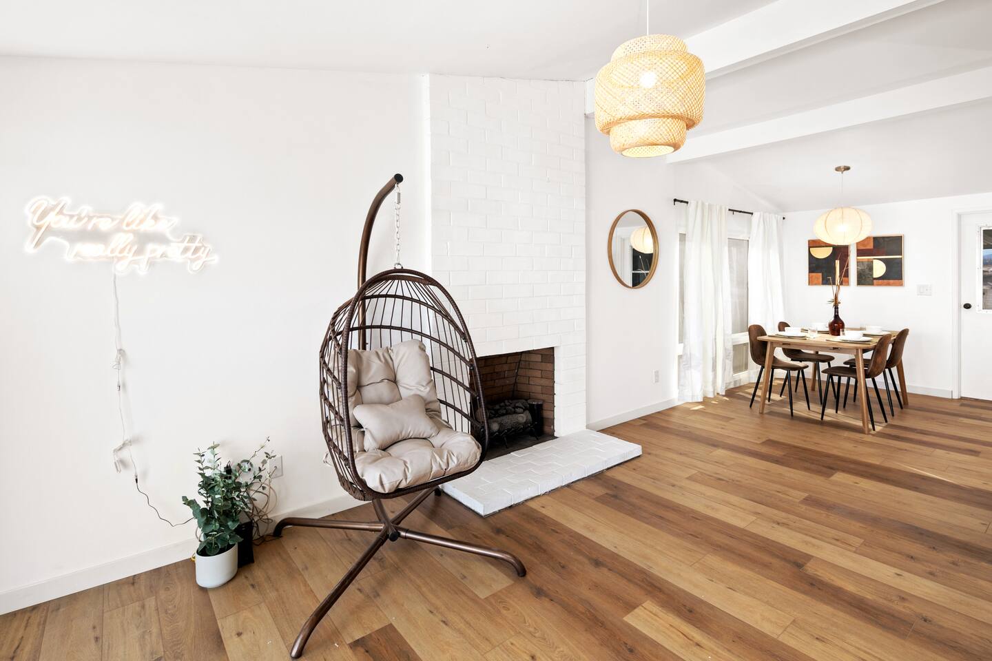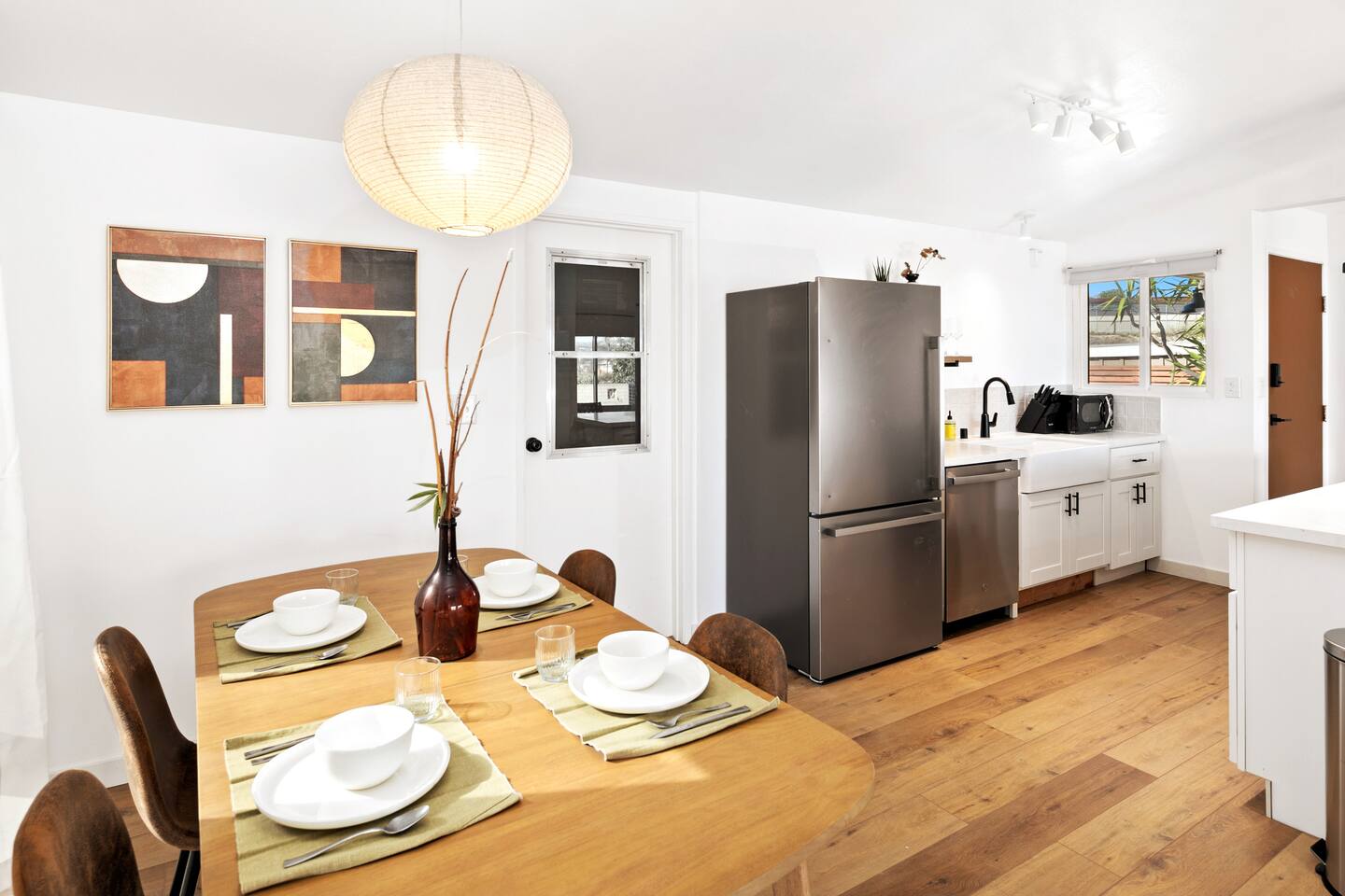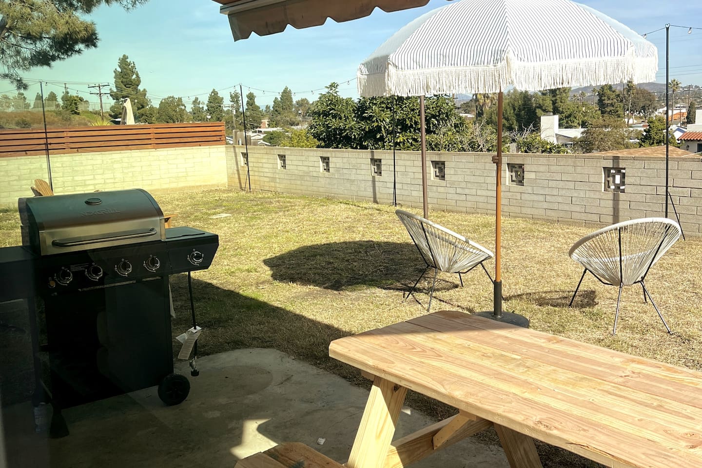 New modern open kitchen with dedicated island bar. 3 stunning bedrooms, 2 new bathrooms, a 60" Samsung smart TV in the living room, open backyard and central A/C. ROOMS-Primary room has a KING size bed with a private bathroom. Second room has a QUEEN bedroom and a dedicated work space. Third room has a FULL bed with perfect access to the backyard views. All memory mattresses are extremely comfortable with hotel quality crisp white linens & towels for your convenience and a fall size standing mirror for you to get ready in. Rooms are all decorated with attention to details and comfort. Each of the bathrooms all have hair dryers, complimentary shampoo, conditioner & gel body wash. In the hallway cabinet 4 beach towels are also provided for guests to use. Each bedroom has an extra blanket in the closet. Kitchen is open, spacious and has a Keurig (pods and ground) coffeemaker, pour over, microwave, blender, toaster, cocktail maker set, a dishwasher and a huge quartz kitchen island where you there's bar seating for those who want a quick bite. Kitchen is also FULLY stocked with all cooking utensils, pots/pans & appliances you need for cooking. Stove has a electric range and a large farmers sink. You can also catch the TV from the kitchen so you can keep up with all the sport games and movies. Dining room has a table for 8. Dining room table or kitchen island are perfect areas to sit and work at as well. To get you started upon your arrival, we do provide a salt & pepper shaker, 6 complimentary coffee pods, 2 dishwasher pods, 2 laundry pods, extra trash bags, cleaning spray, sponge, and extra paper towel roll. A first aid kit is also provided in the bar cabinet. Living room has a comfy couch along with a couple of leather seats with a 60" TV along with High-speed (1 GB) internet connection - perfect for those who need speed for work. Media cabinet has several board games such as Tacos and Burritos, Do You Know Your Family, playing cards and puzzles. We also have a vintage Sony record player with several vinyls available, choose one and enjoy your morning coffee with some crisp music! Backyard features a brand new BBQ, a comfortable seating area/couch with a propane fire pit to hang out and relax in. Also has a dining table that seats up to 6 with an umbrella for those sunny days, a corn hole game, jenga, and connect 4. This house is stocked with bath towels, hairdryers, Irons, and hotel-style body wash and shampoo/conditioner. If you need anything additional during your stay, please feel free to reach out by messaging me on the Airbnb thread.