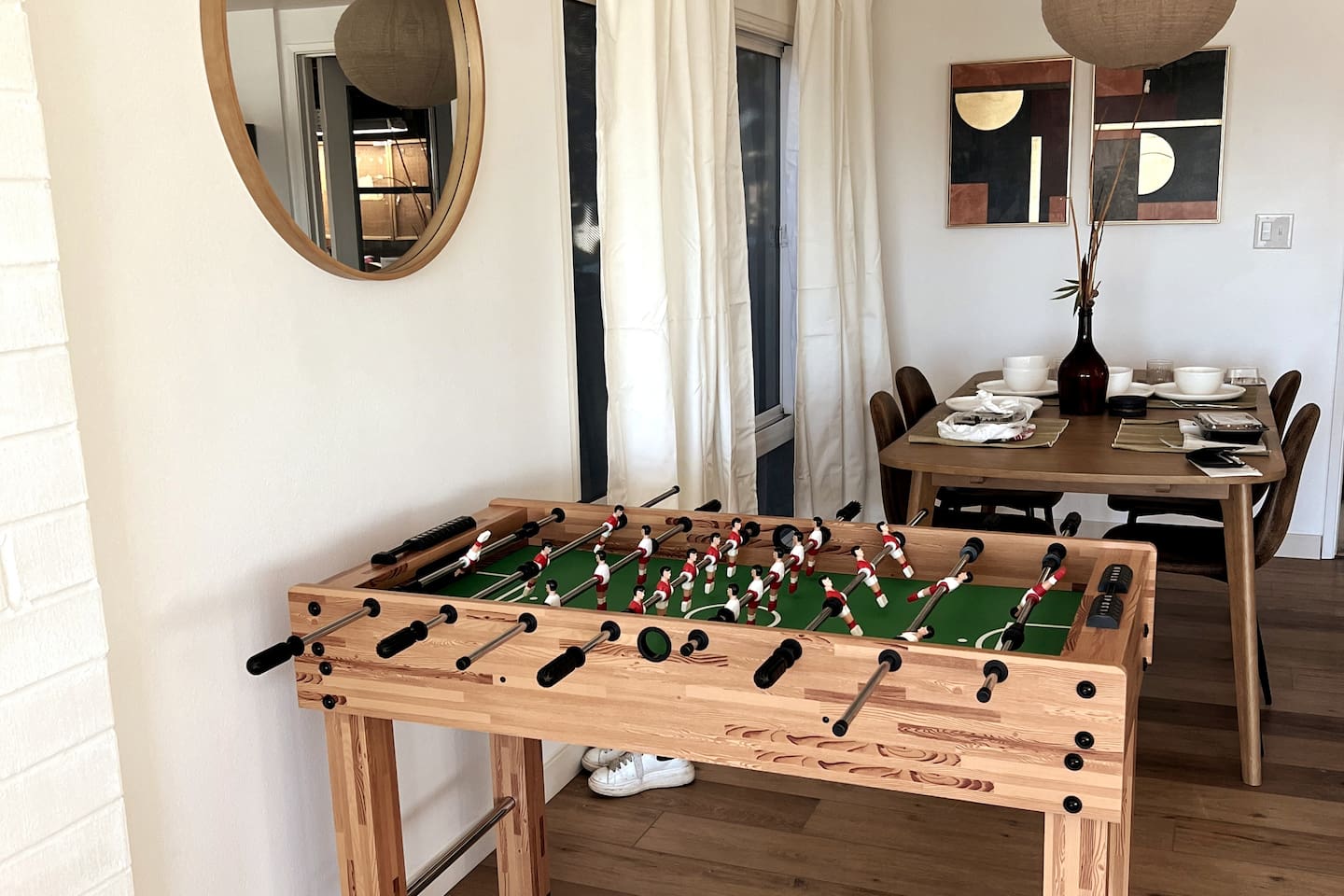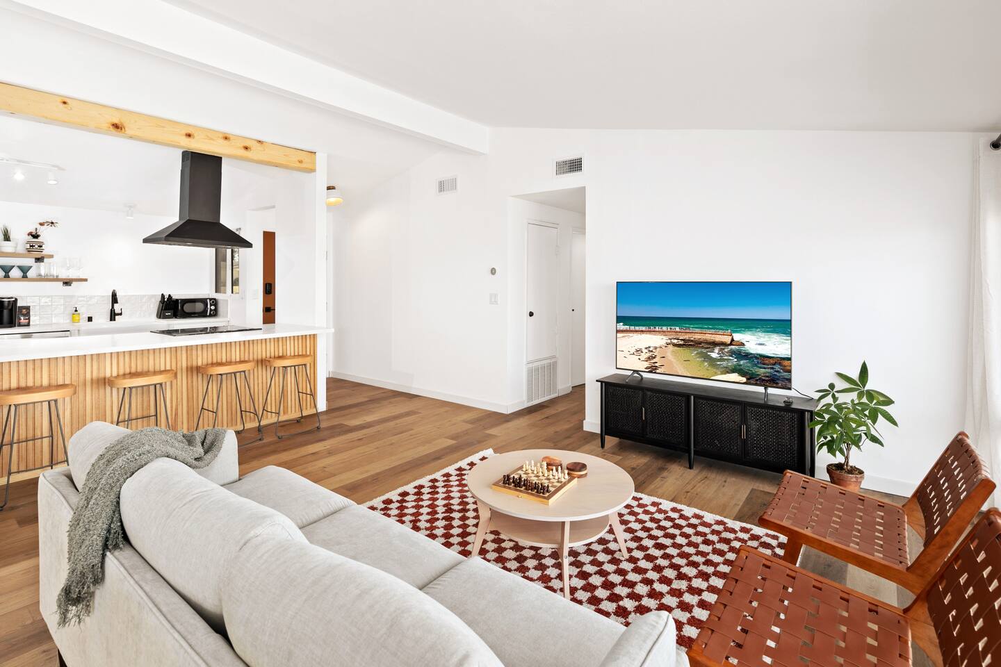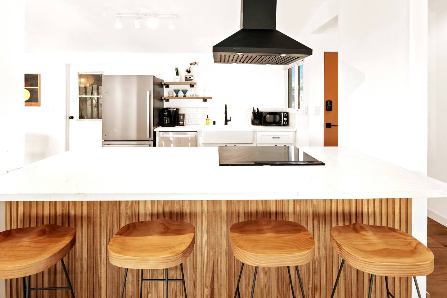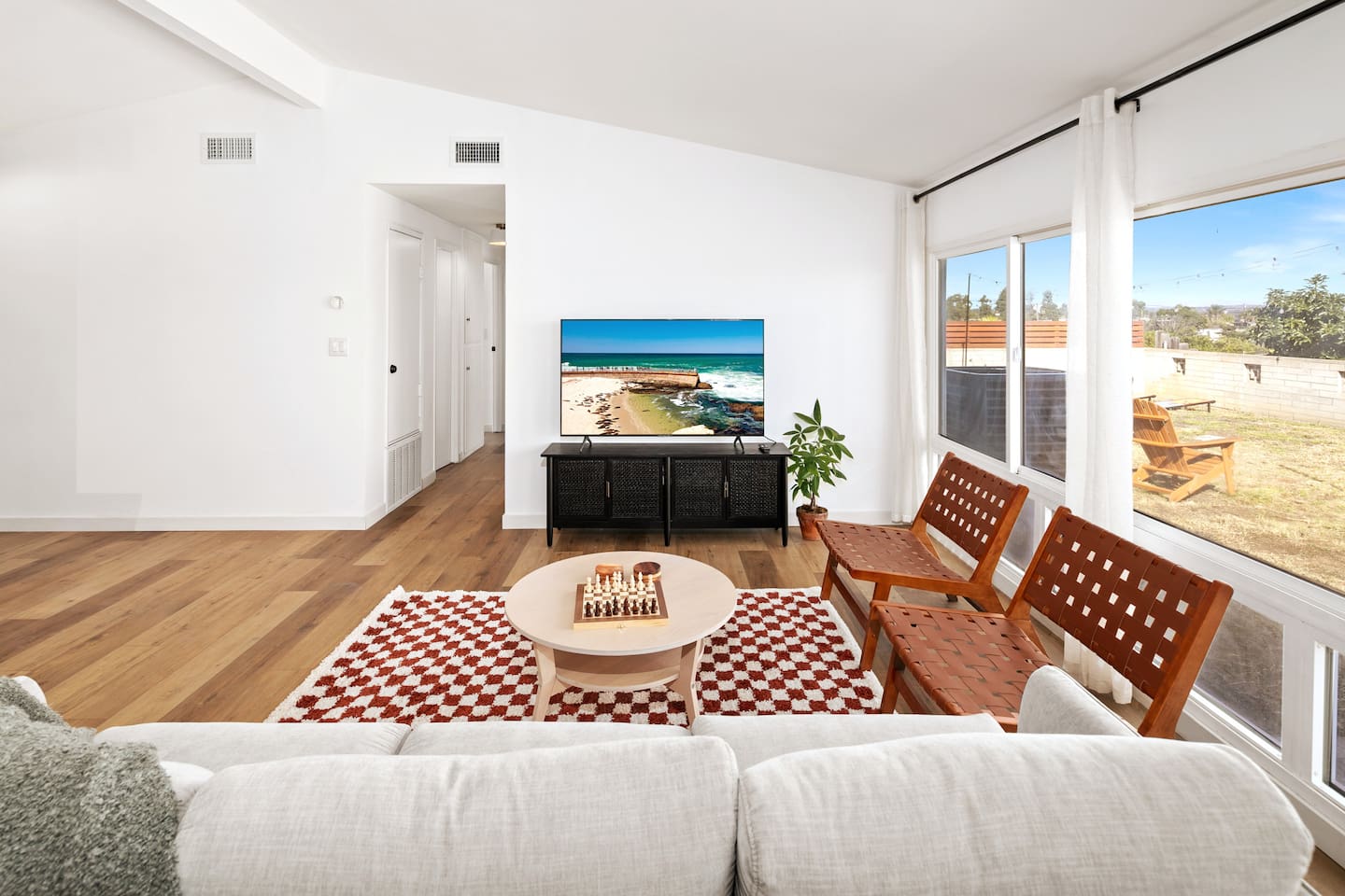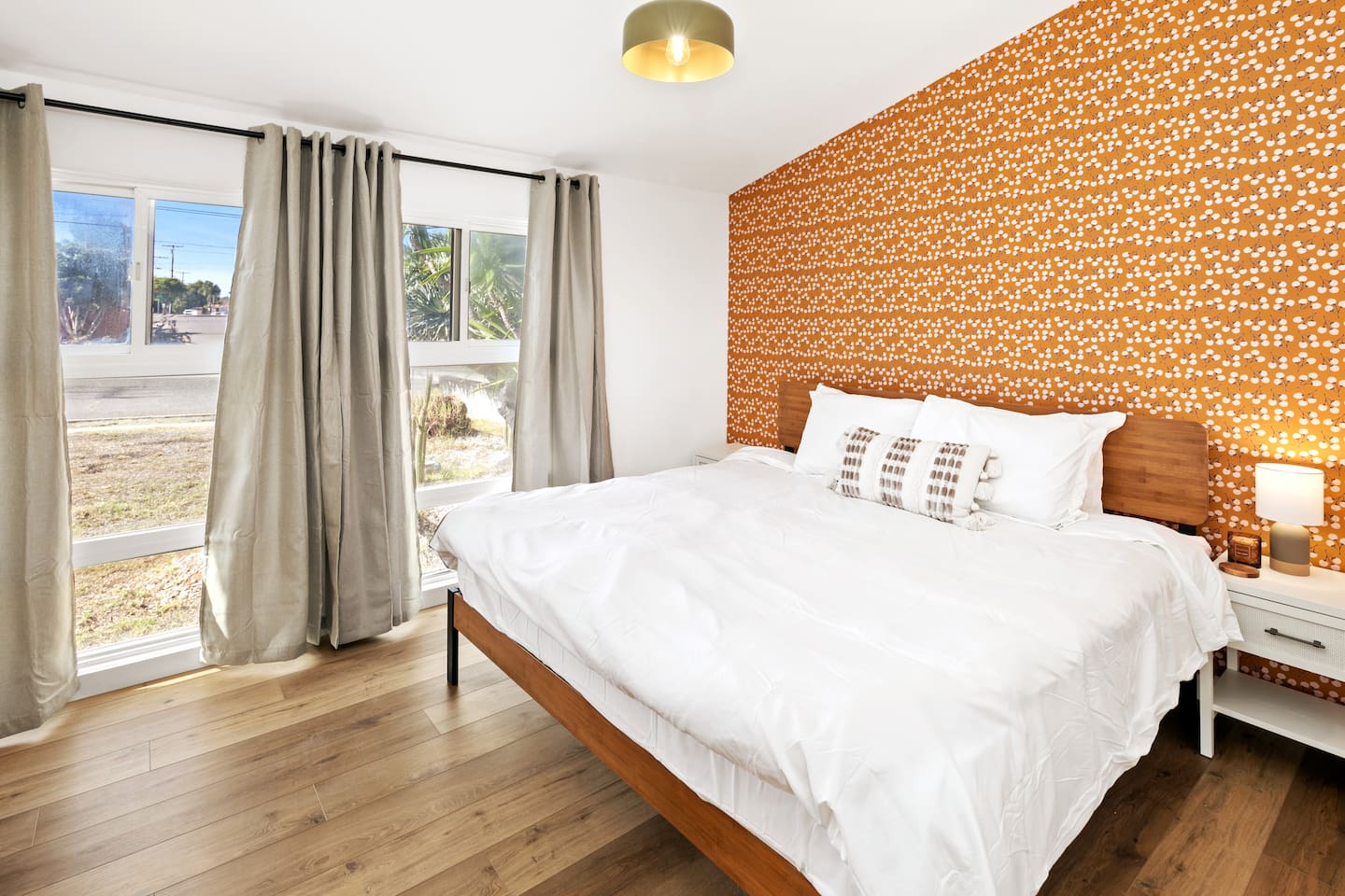 New modern open kitchen with dedicated island bar. 3 stunning bedrooms, 2 new bathrooms, a 60" Samsung smart TV in the living room, open backyard and central A/C. ROOMS-Primary room has a KING size bed with a private bathroom. Second room has a QUEEN bedroom and a dedicated work space. Third room has a FULL bed with perfect access to the backyard views. All memory mattresses are extremely comfortable with hotel quality crisp white linens & towels for your convenience and a fall size standing mirror for you to get ready in. Rooms are all decorated with attention to details and comfort. Each of the bathrooms all have hair dryers, complimentary shampoo, conditioner & gel body wash. In the hallway cabinet 4 beach towels are also provided for guests to use. Each bedroom has an extra blanket in the closet. Kitchen is open, spacious and has a Keurig (pods and ground) coffeemaker, pour over, microwave, blender, toaster, cocktail maker set, a dishwasher and a huge quartz kitchen island where you there's bar seating for those who want a quick bite. Kitchen is also FULLY stocked with all cooking utensils, pots/pans & appliances you need for cooking. Stove has a electric range and a large farmers sink. You can also catch the TV from the kitchen so you can keep up with all the sport games and movies. Dining room has a table for 8. Dining room table or kitchen island are perfect areas to sit and work at as well. To get you started upon your arrival, we do provide a salt & pepper shaker, 6 complimentary coffee pods, 2 dishwasher pods, 2 laundry pods, extra trash bags, cleaning spray, sponge, and extra paper towel roll. A first aid kit is also provided in the bar cabinet. Living room has a comfy couch along with a couple of leather seats with a 60" TV along with High-speed (1 GB) internet connection - perfect for those who need speed for work. Media cabinet has several board games such as Tacos and Burritos, Do You Know Your Family, playing cards and puzzles. We also have a vintage Sony record player with several vinyls available, choose one and enjoy your morning coffee with some crisp music! Backyard features a brand new BBQ, a comfortable seating area/couch with a propane fire pit to hang out and relax in. Also has a dining table that seats up to 6 with an umbrella for those sunny days, a corn hole game, jenga, and connect 4. This house is stocked with bath towels, hairdryers, Irons, and hotel-style body wash and shampoo/conditioner. If you need anything additional during your stay, please feel free to reach out by messaging me on the Airbnb thread.